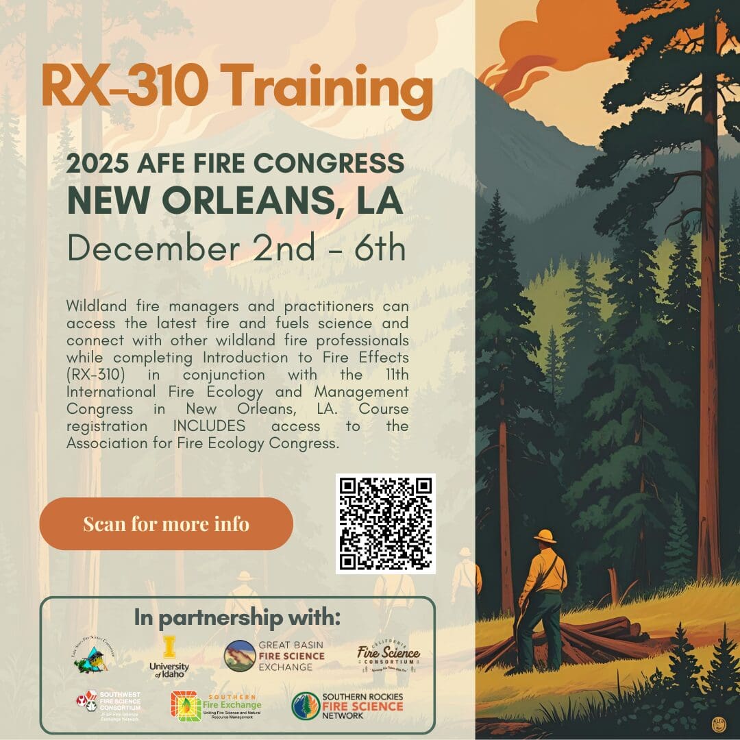 The NWCG RX-310 Course, Introduction to Fire Effects, will be offered this December 2025 in conjunction with the 11th International Fire Ecology and Management Congress in New Orleans, LA.